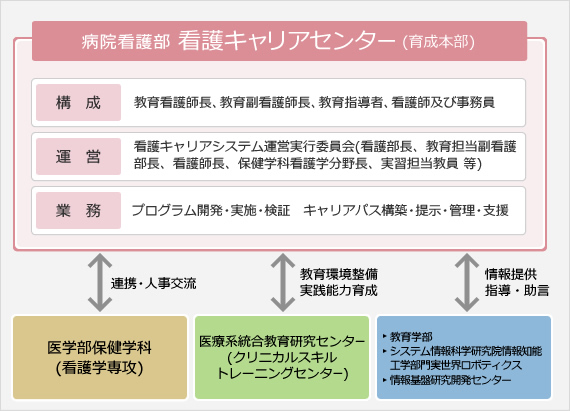 看護部に設置した「看護キャリアセンター」を育成本部と位置づけ、看護部および保健学科との連携を行い、看護キャリアシステム運営実行委員会のメンバーを中心に、プロジェクトを展開します。