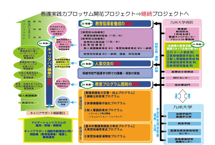 平成21年度から5か年の文部科学省大学改革推進事業として推進してきた「看護実践力ブロッサム開花継続プロジェクト」の成果が評価され、事業期間が終了した平成26年度からは事業継続のため、病院より毎年約1,235万円の予算が認められました。これにより、九州大学病院看護部において、自律して事業継続できるよう支援体制を整備しました。