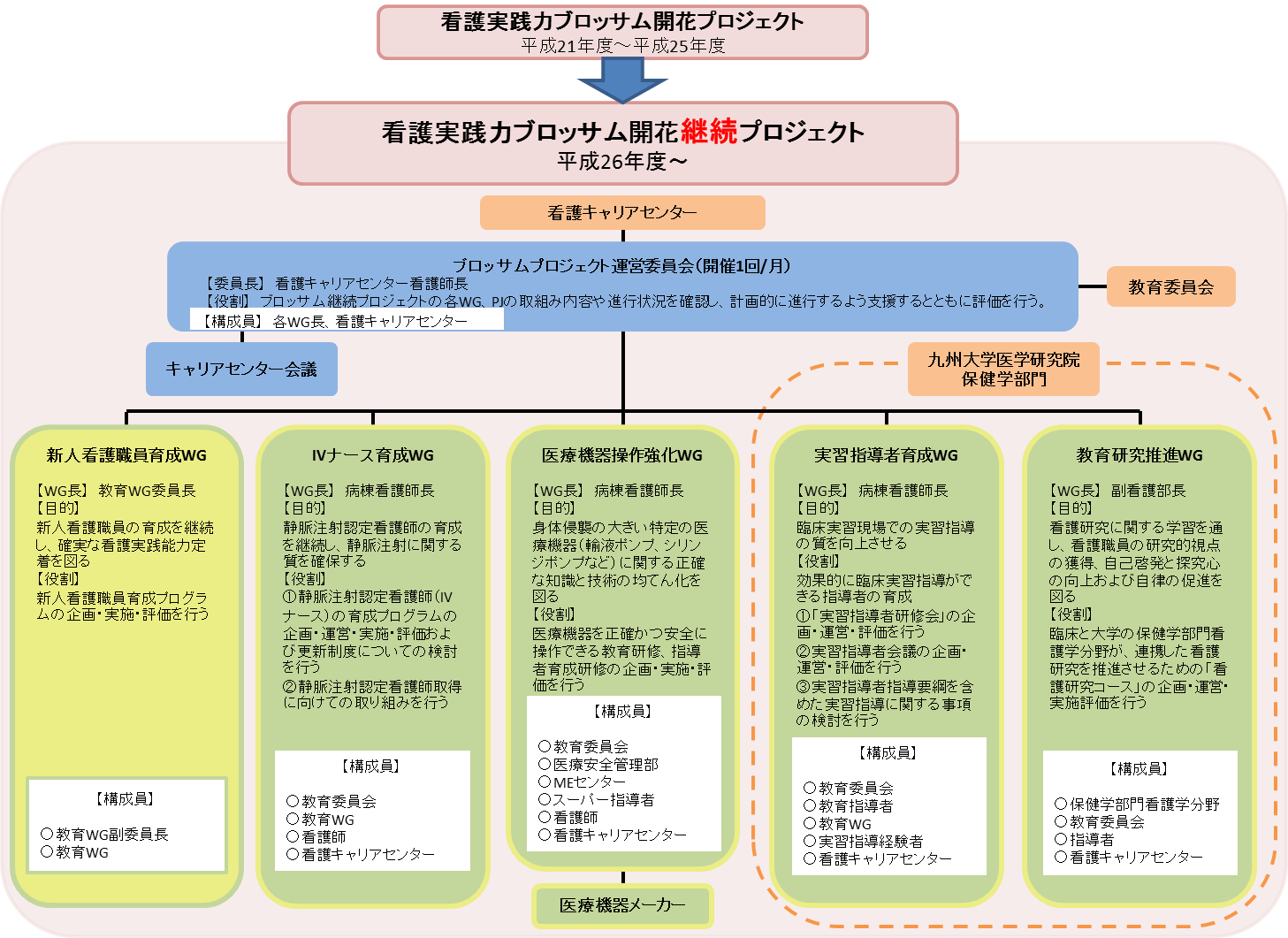 平成26年度からの「看護実践力ブロッサム開花継続プロジェクト」では、5か年間で構築した人材養成システムを持続的に継続できるよう、4本柱の取り組みの継続可能な体制を再検討しました。その結果、5か年の取り組みプログラムを再編し、再分類・集約した上で、プログラム毎にワーキンググループを立ちあげ、取組みを推進させることにしました。