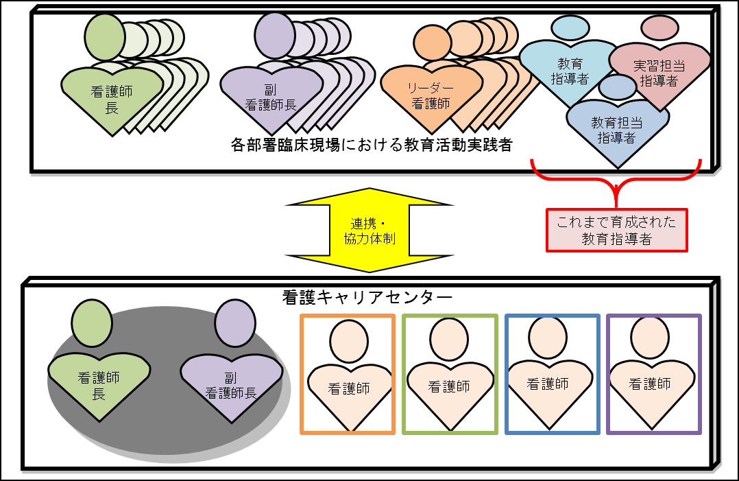 平成21年度〜25年度までの「看護実践力ブロッサム開花プロジェクト」では、【教育プログラム開発】【教育指導者養成】【人事交流】【キャリアパス構築】の4本柱で事業に取り組み、効果的な人材養成システムとして事業を推進させてきました。
